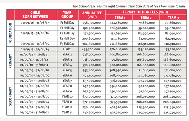 Học phí mầm non chương trình tích hợp khoảng 131 đến 189 triệu đồng/năm, chương trình quốc tế khoảng 238 đến hơn 305 triệu đồng/năm. Đối với cấp tiểu học, học phí từ khoảng 220 đến hơn 221 triệu đồng/năm cho chương trình song ngữ và khoảng 400 triệu đồng/tháng cho chương trình quốc tế.