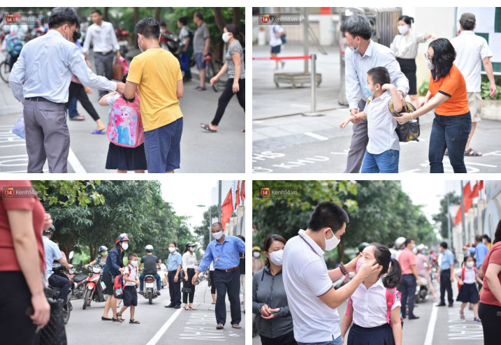 Phụ huynh cẩn thận đưa đón con trong ngày đầu đi học trở lại.