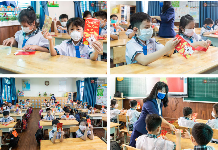 Bên cạnh đó, trường cũng sẽ lì xì đồng thời tặng mỗi em một câu chúc liên quan đến cách phòng tránh dịch.