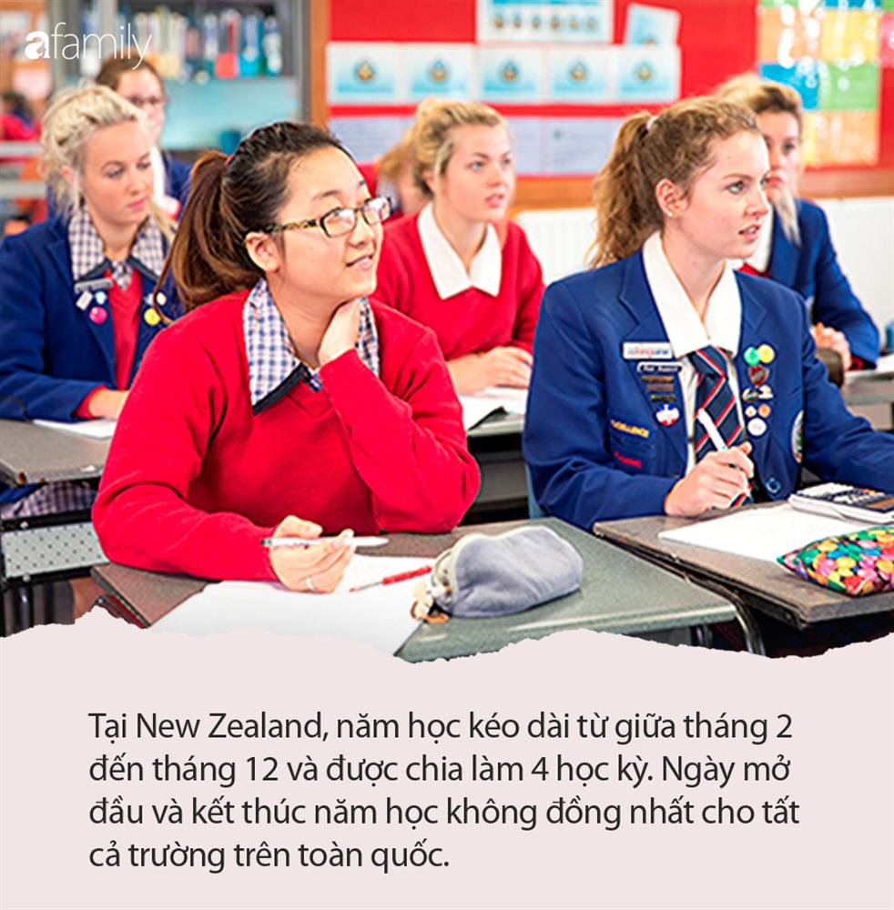 Tại New Zealand, năm học kéo dài từ giữa tháng 2 đến tháng 12 và được chia làm 4 học kỳ. Ngày mở đầu và kết thúc năm học không đồng nhất cho tất cả trường trên toàn quốc. Kỳ nghỉ giữa các học kỳ thường kéo dài hai tuần. Số kỳ nghỉ chính tương ứng với số kỳ học.