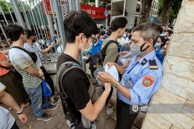 Ngay từ lúc 13h, 2 cổng trường ĐH Bách Khoa Hà Nội đã kín đặc sinh viên từ khắp nơi đổ về làm bài kiểm tra tư duy. Trước khi vào cổng, thí sinh buộc yêu cầu phải đo thân nhiệt, rửa tay sát trùng đồng thời đeo 100% khẩu trang.