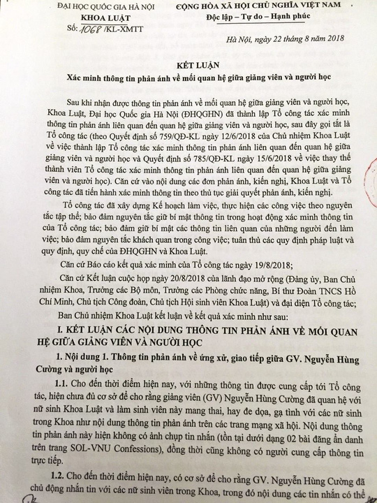Lãnh đạo khoa Luật, ĐH Quốc gia Hà Nội vừa có kết luận xác minh thông tin phản ánh liên quan đến việc tiến sĩ - giảng viên Nguyễn Hùng Cường bị tố "quấy rối" các nữ sinh.