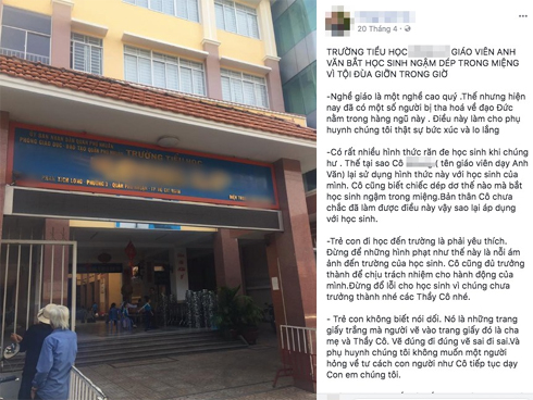 Trước đó, ngày 20.4, một tài khoản Facebook đăng tải thông tin về việc cô giáo dạy Tiếng Anh có hành vi không chuẩn mực khi bắt một em học sinh tiểu học ngậm nguyên chiếc dép vào miệng chỉ vì đùa giỡn trong giờ học.