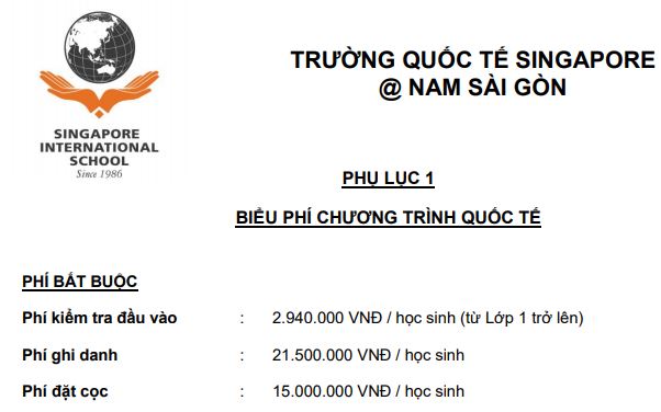 Trường Quốc tế Singapore công khai mức phí kiểm tra đầu vào là 2,94 triệu đồng/học sinh, phí ghi danh 21,5 triệu đồng/học sinh và phí đặt cọc là 15 triệu đồng/năm. Phí ghi danh sẽ không hoàn trả cho phụ huynh và phí đặt cọc sẽ phải đóng theo năm.