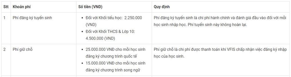 Phí đăng ký tuyển sinh của trường là 2,25-4,5 triệu đồng cho mỗi học sinh nhập học, không hoàn lại. Phí giữ chỗ là 25 triệu đồng cho mỗi học sinh đăng ký chương trình quốc tế và 15 triệu đồng cho mỗi học sinh đăng ký chương trình song ngữ. Phí giữ chỗ là chi phí được thanh toán khi VFIS chấp nhận việc đăng ký nhập học của học sinh.