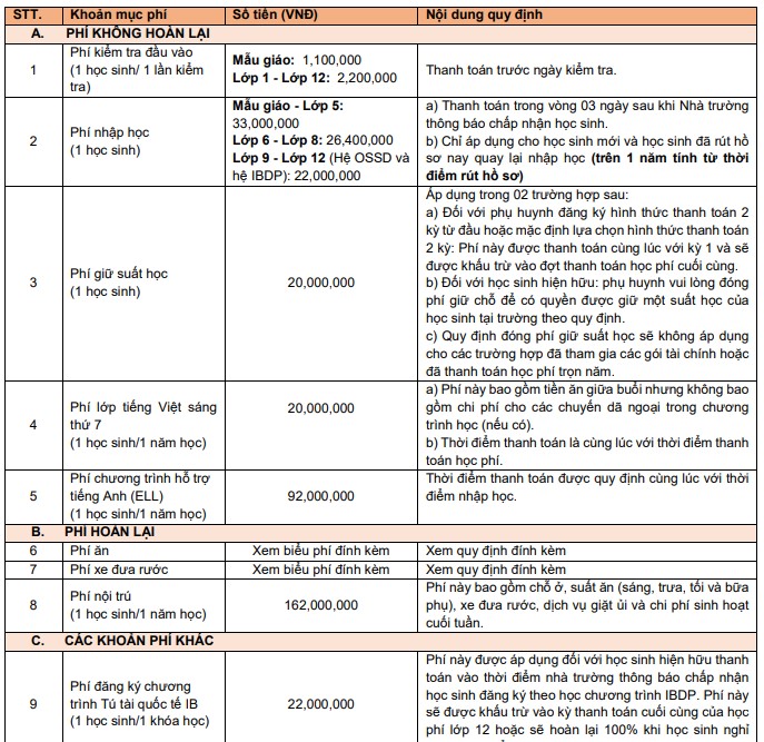 Sau khi được nhận học, phụ huynh sẽ đóng khoản phí nhập học và đóng 1 lần trong suốt thời gian học tại trường. Ngoài ra, phụ huynh đóng thêm khoản phí đặt cọc 21 triệu đồng/năm cùng với học phí. Nếu thanh toán theo kỳ thì phí đặt cọc là 30 triệu đồng/năm. Đây là khoản tiền sẽ đóng mỗi năm.