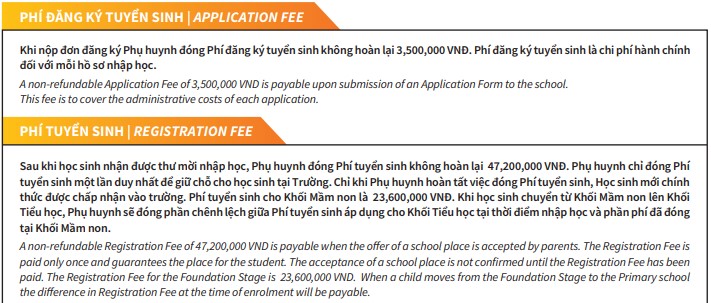 Sau khi học sinh nhận được thư mời nhập học, phụ huynh đóng phí tuyển sinh không hoàn lại 47,2 triệu đồng/học sinh. Đây là khoản phí đóng 1 lần duy nhất để giữ chỗ cho học sinh tại trường. Tuy nhiên, chỉ khi phụ huynh hoàn tất việc đóng này, học sinh mới chính thức được chấp nhận vào trường.