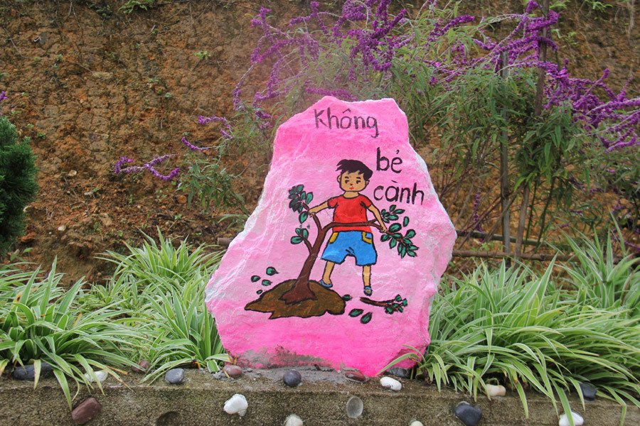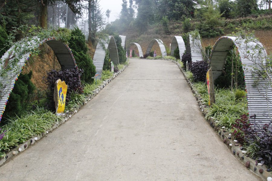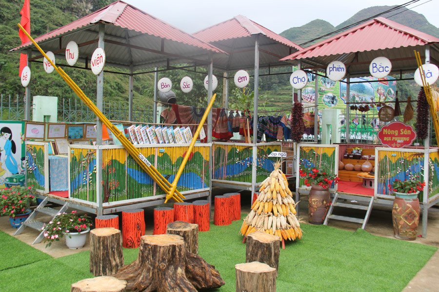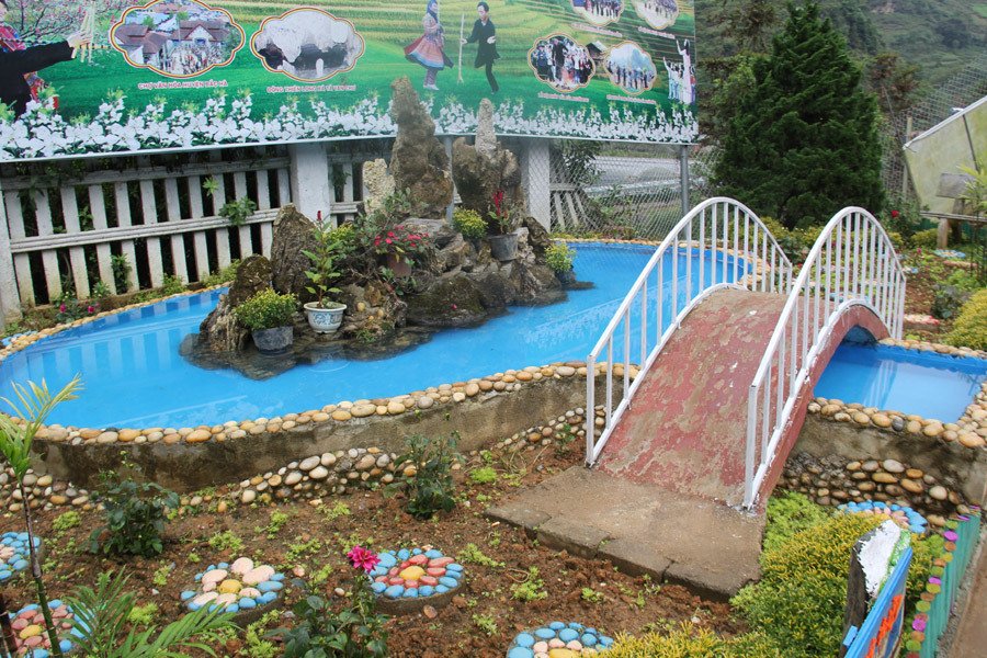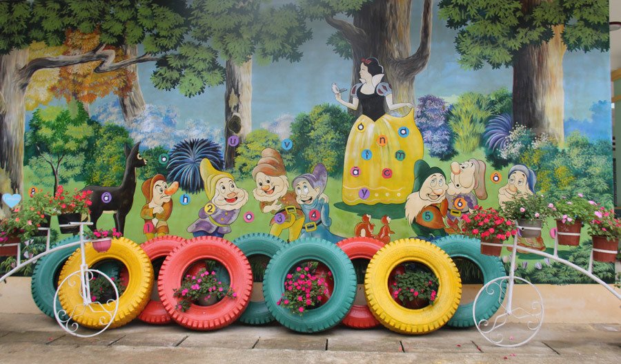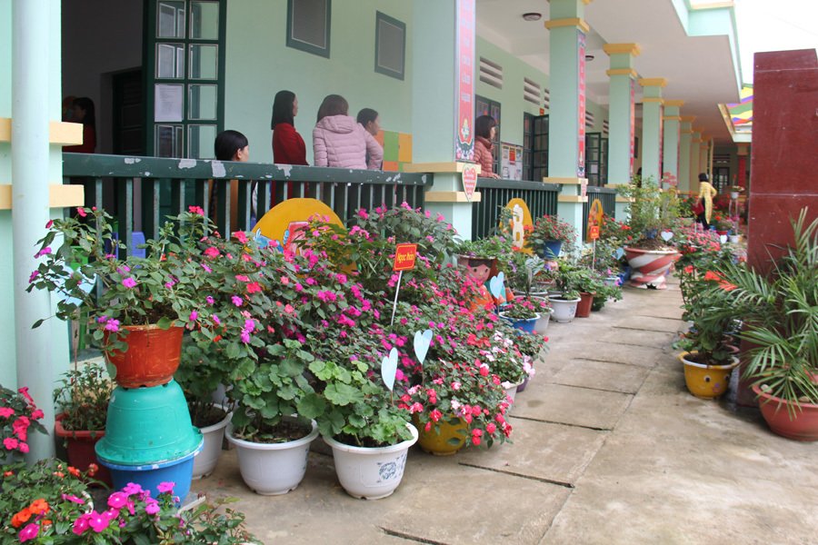 Con đường dốc đi từ cổng trường xuống được trang trí bằng những mái vòm ấn tượng Bên đường là những phiến đá được các cô giáo đi nhặt nhạnh về tô vẽ thành những lời dặn dò dễ hiểu, bắt mắt Khu vực ngoài trời trưng bày những bộ váy áo của người Mông để dạy trẻ về đặc trưng văn hóa địa phương Những chiếc bánh xe bỏ đi được các cô giáo tạo dựng thành một bức tranh cổ tích đầy màu sắc Hoa được trồng ở khắp nơi trong sân trường Phần tường rào cũng được chăm chút bằng những mảng màu bắt mắt Những khóm rau xanh mướt được các cô tự tay trồng và chăm bón Chậu hoa được đặt tràn lên cửa lớp Học sinh của trường rất tự tin và dạn dĩ khi gặp người lạ |