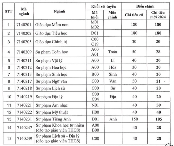 Theo điều chỉnh này, một số ngành giảm mạnh chỉ tiêu như Giáo dục Mầm non từ 70 xuống còn 20 chỉ tiêu, Sư phạm Toán học từ 100 xuống còn 31 chỉ tiêu, Sư phạm Vật lý, Hóa học, Sinh học, Lịch sử, tiếng Pháp cùng giảm 40 chỉ tiêu, từ 60 xuống còn 20 chỉ tiêu.