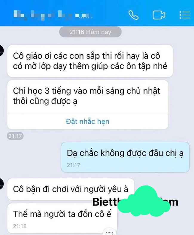 Một bà mẹ mới đây cũng nhắn tin nhờ cô giáo mở lớp phụ đạo cho con mình và các bạn cùng lớp. Chuyện chẳng có gì đáng nói nếu phụ huynh này không có câu chốt vô tư đến mức... vô duyên khiến không chỉ cô giáo mà ai nấy chết sững: