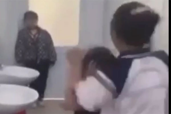 Học sinh bị đánh túi bụi trong nhà vệ sinh (Ảnh cắt từ clip)