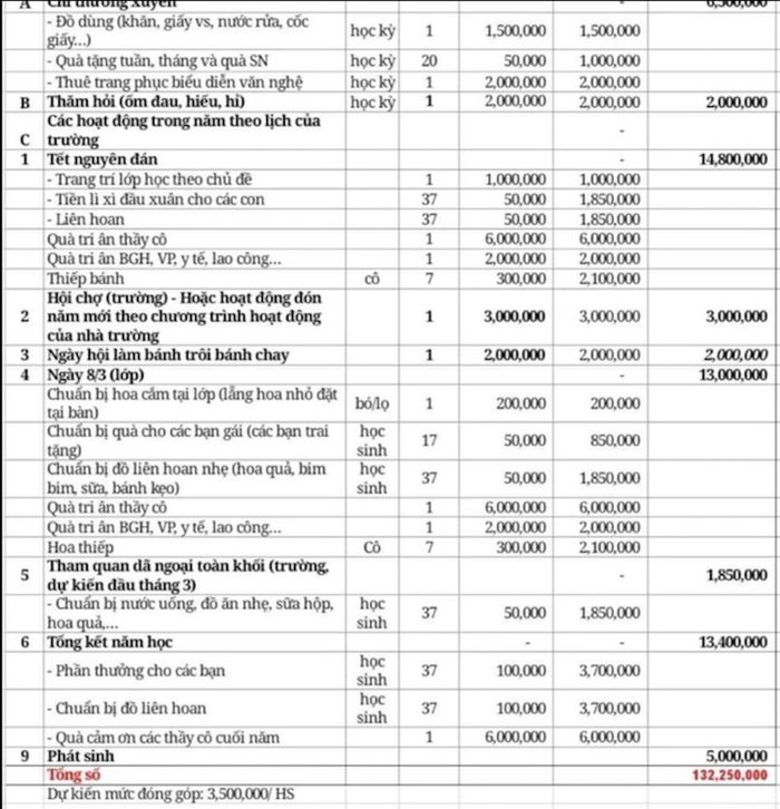 Ban đại diện cha mẹ học sinh lớp 1/3, trường Tiểu học Võ Thị Sáu (quận 7, TP.HCM), đưa ra kế hoạch chi cho năm học 2022 - 2023 lên tới 130,2 triệu đồng. Lớp có 41 phụ huynh, tính trung bình mỗi phụ huynh đóng hơn 3,1 triệu đồng.