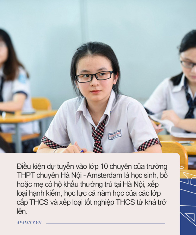 Theo kế hoạch tuyển sinh lớp 10 THPT năm học 2021-2022 do UBND TP.Hà Nội phê duyệt, điều kiện dự tuyển vào lớp 10 chuyên của trường THPT chuyên Hà Nội - Amsterdam, trường THPT chuyên Nguyễn Huệ, trường THPT Chu Văn An và Trường THPT Sơn Tây là học sinh, bố hoặc mẹ có hộ khẩu thường trú tại Hà Nội, xếp loại hạnh kiểm, học lực cả năm học của các lớp cấp THCS và xếp loại tốt nghiệp THCS từ khá trở lên.