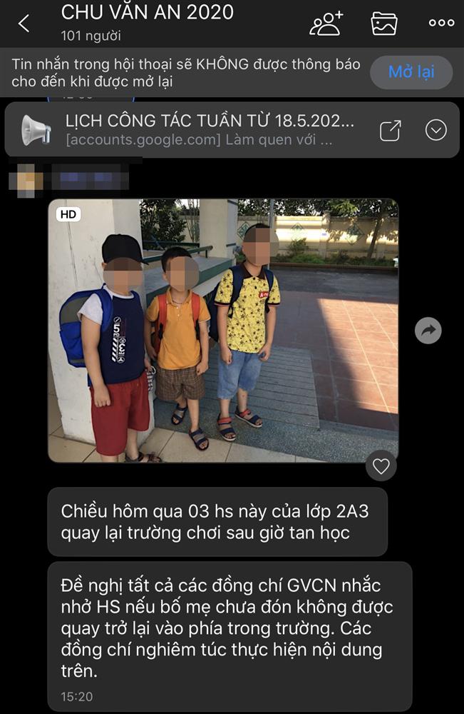 Vào chiều ngày 16/5/2020 tôi đến đón con học lớp 3, do công việc nên tôi đón muộn hơn so với giờ tan học của các con. Tôi vào trường tìm nhưng không thấy con tôi đâu. Khi ra ngoài cổng phụ thì tôi thấy con đang lang thang ở ven đường. Liên lạc với giáo viên chủ nhiệm để hỏi về việc này thì cô trả lời tôi do chỉ thị của nhà trường (như ảnh) là không cho học sinh quay lại trong trường sau khi tan học. Nếu giáo viên cho học sinh vào trường thì sẽ bị Ban giám hiệu chụp ảnh lại để phê bình và hạ thi đua cá nhân.
