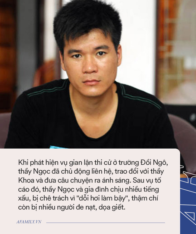 Cho đến khi phát hiện vụ gian lận thi cử ở trường Đồi Ngô, thầy Ngọc đã chủ động liên hệ, trao đổi với thầy Khoa và đưa câu chuyện ra ánh sáng. Vụ tố cáo khiến thầy Ngọc và gia đình chịu nhiều tiếng xấu, bị chê trách vì "dỗi hơi làm bậy", thậm chí còn bị nhiều người đe nạt, dọa giết.