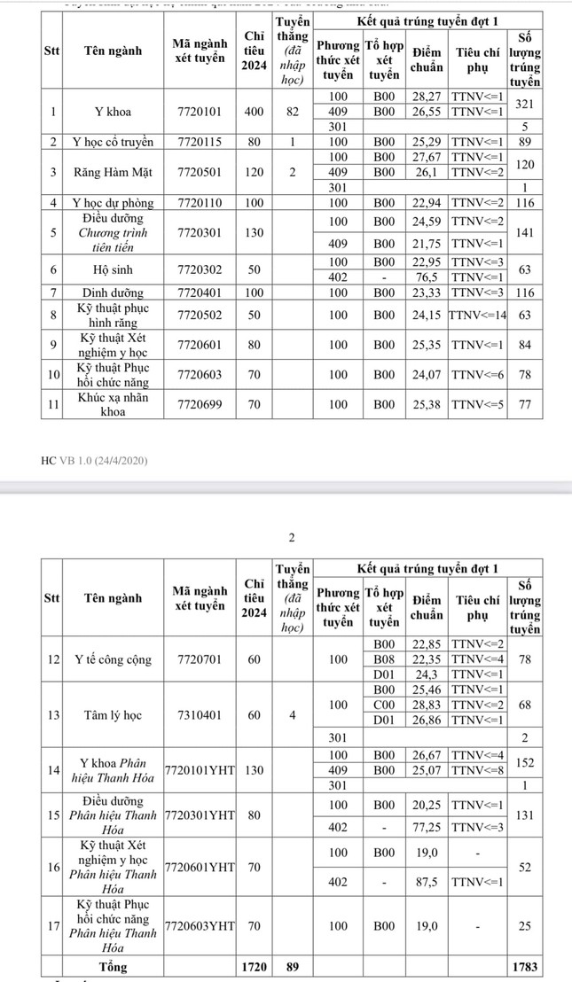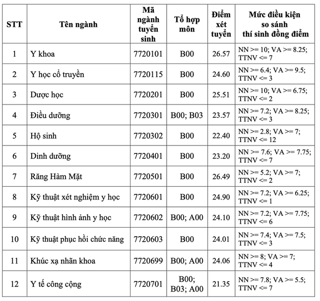 Điểm chuẩn trường Đại học Y Thái Bình năm 2024: