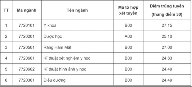 Ở tổ hợp truyền thống B00, Y khoa vẫn dẫn đầu với 28,27 điểm, tăng 0,54 so với năm ngoái. Nếu có chứng chỉ tiếng Anh IELTS 6.5 hoặc tiếng Pháp DELF B2 (hoặc tương đương), thí sinh chỉ cần đạt 26,55 điểm để đỗ.