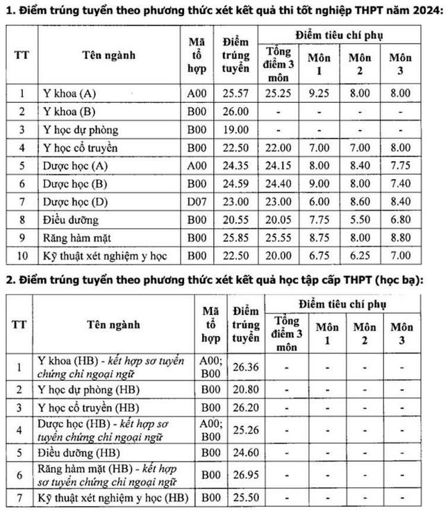 Điểm chuẩn trường Đại học Y Dược , ĐH Huế năm 2024: