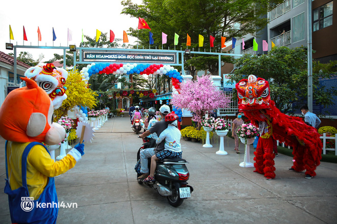 Ghi nhận tại trường Tiểu học Lê Đức Thọ, quận Gò Vấp, ngay từ sáng sớm, không khí trước cổng trường đã rộn ràng hơn bao giờ hết. Suốt nhiều tháng vắng bóng học trò nên thầy cô đã có mặt từ sớm để đón các em ngay từ cổng ra vào. Dù Tết Nguyên đán đã qua song vì là ngày đầu tiên học sinh tựu trường dịp năm mới nên nhà trường đã chuẩn bị hẳn một đội lân để chào đón các em.