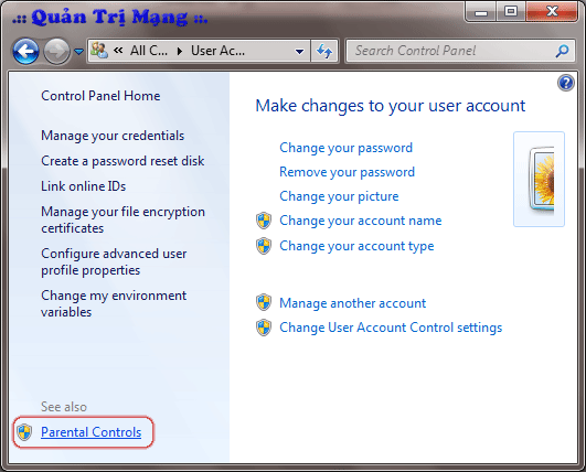 Để bắt đầu sử dụng, bạn đăng nhập bằng tài khoản Administrator và nhấp chuột vào Start > Control Panel > User Accounts and Family Safety > Parental Controls. Lựa chọn này sẽ giúp mở ra cửa sổ Windows 7 Parental Controls.