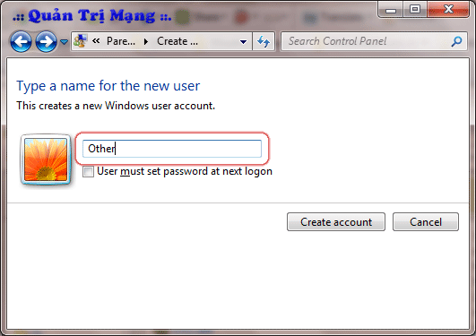 Trong giao diện điều khiển của Parental Controls , bạn chọn một tài khoản mà bạn muốn áp dụng tính năng kiểm soát của cha mẹ. Nếu không có tài khoản khách, bạn có thể tạo ra một tài khoản khách mới (User Accounts - Create a new account), đó chính là tài khoản mà bạn cho phép con trẻ của bạn có quyền sử dụng.