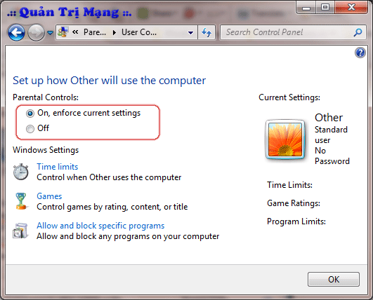 Thứ hai, bạn không thể áp dụng quy tắc Parental Control vào một tài khoản có quyền quản trị (Administrator). Lý do rất đơn giản: bất cứ ai có quyền quản trị thì có thể tiến hành kiểm soát hoạt động trên Parental Control. Cuối cùng là bạn không thể áp dụng những quy tắc này cho một tài khoản Guest (khách).