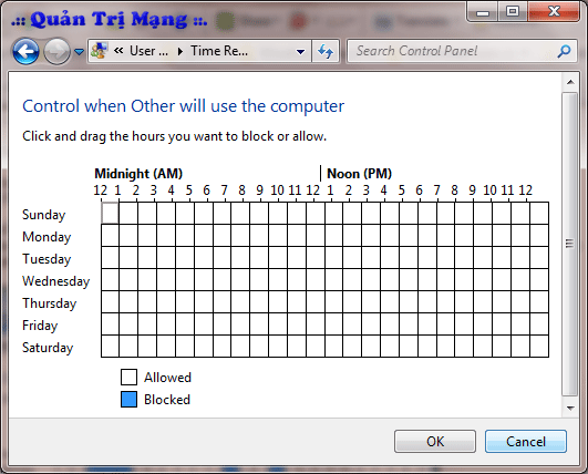 Bạn có thể thiết lập thông số giờ sử dụng tối đa trong một ngày hoặc thậm chí trong một tuần. Trong bảng hiện ra, bạn có thể chọn ô màu trắng là cho phép sử dụng trong khoảng thời gian đó, còn màu xanh sẽ chặn không cho sử dụng. Thiết lập xong bạn nhấp OK để xác nhận thay đổi.