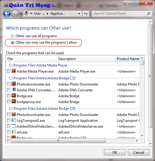 - Ngoài ra, một lựa chọn khác có tên Allow and Block Specific Programs cho phép bạn có thể tiến hành chặn hoặc cho phép một số chương trình cụ thể nào đó hoạt động. Để thiết lập, bạn cần mất một chút thời gian để Windows 7 nạp danh sách tất cả các chương trình, ứng dụng và tiện ích được cài đặt trên máy tính của bạn.