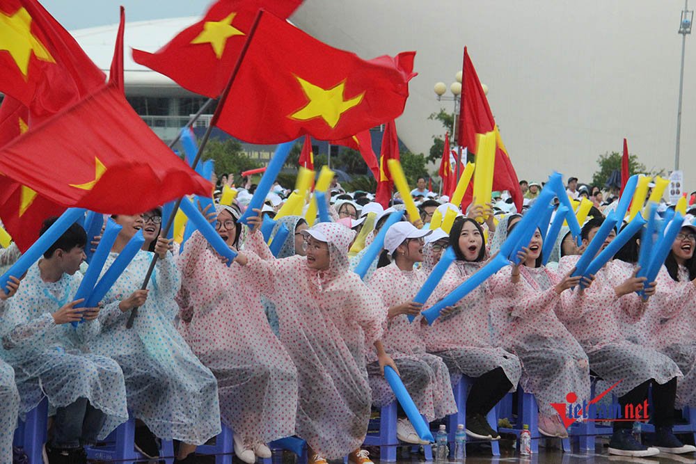 Tại đây, 5.000 học sinh mặc áo mưa và tung cờ đỏ sao vàng ngợp trời để cổ vũ. Ngoài ra, học sinh Quảng Ninh cũng dùng các tấm bảng nhỏ để xếp thành hình núi Gà Chọi (biểu tượng của du lịch Quảng Ninh) xen giữa là vòng nguyệt quế.