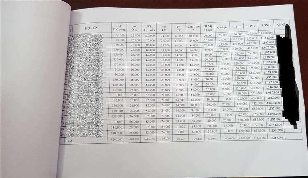 Quyển sổ thu một phụ huynh chụp lại khi lên Phòng Tài vụ của Trường Tiểu học Sơn Đồng đóng tiền cho con. Có cột ký tên xác nhận của những phụ huynh đã đóng tiền.