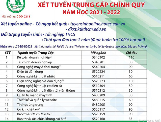 Tuyển sinh năm học 2021 - 2022 của Trường CĐ Kinh tế - Kỹ thuật TP.HCM.