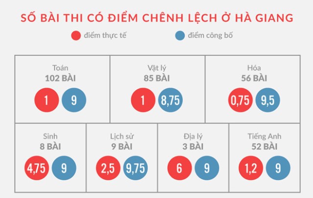Kết quả các môn thi của các thí sinh ở Hà Giang sau khi chấm thẩm định. Đồ họa: Ngọc Châu.