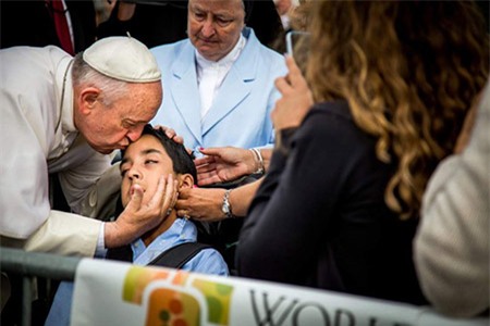 đứng đầu tòa thánh Vatican hôn lên trán một cậu bé mắc chứng bại não