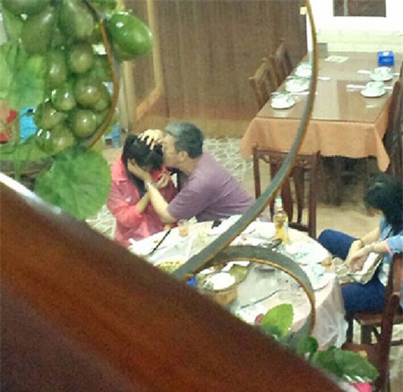 Bức ảnh cho thấy, giáo sư Wang Xiaojian ngồi cùng bàn ăn với hai cô gái khoảng 20 tuổi. Mặc dù đang ngồi trong nhà hàng và khá đông khách nhưng vị giáo sư đứng tuổi này vẫn "thân mật" thái quá với cả hai nữ sinh.