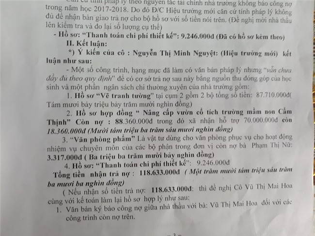 | Ngoài số nợ trong biên bản bàn giao giữa hai hiệu trưởng trường mầm non Cẩm Thịnh, bà Hoa còn nợ tiền giáo viên |
