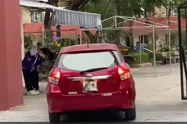 Hình ảnh 2 học sinh cúi người chào khi thấy ô tô của giáo viên vào cổng trường (Ảnh cắt từ clip).