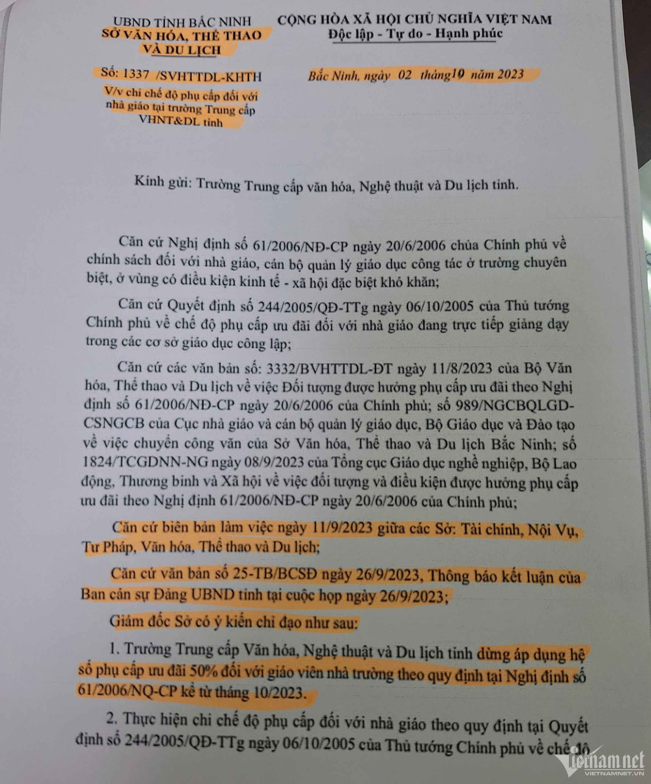 Thông báo của Sở VHTT&Dl tỉnh Bắc Ninh về việc dừng áp dụng hệ số phụ cấp ưu đãi 50% đối với giao viên Trường Trung cấp Văn hoá Nghệ thuật và Du lịch.