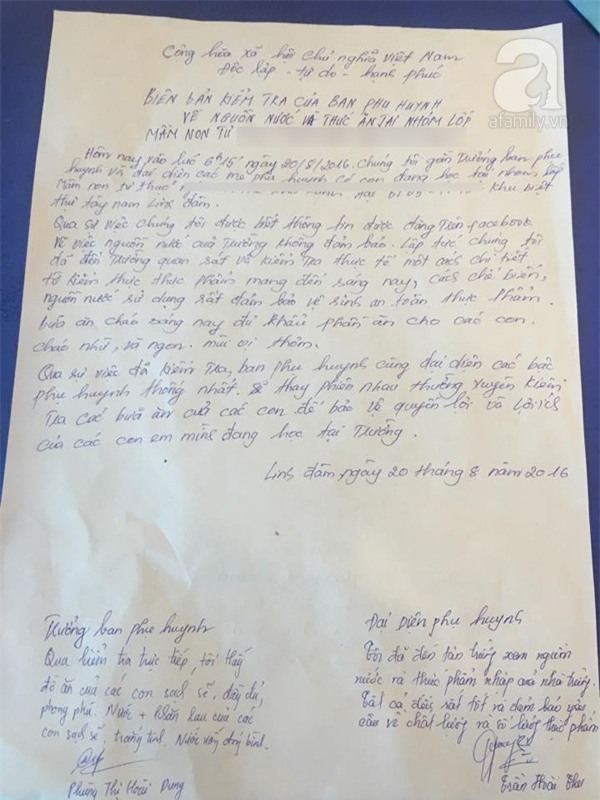 Theo cô Thúy, ngay sau đó, phụ huynh học sinh còn trực tiếp kiểm tra toàn bộ thực phẩm, nguồn nước nhà trường đều thấy đảm bảo an toàn vệ sinh thực phẩm.