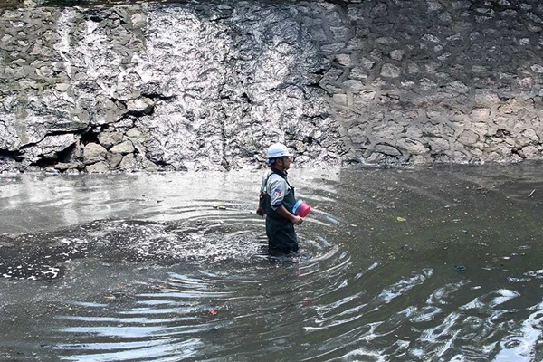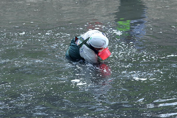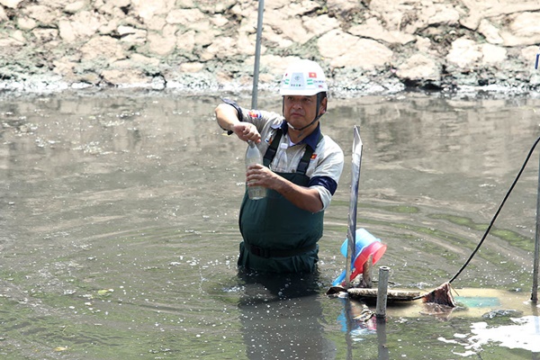 TS Kubo Jun (cố vấn kỹ thuật Tổ chức xúc tiến thương mại - môi trường Nhật Bản, chuyên gia công nghệ máy sục khí công nghệ nano JVE) đã trực tiếp lội xuống lòng sông Tô Lịch (Hà Nội) để kiểm tra thiết bị làm sạch cùng chất lượng nước sông trong 2 ngày.