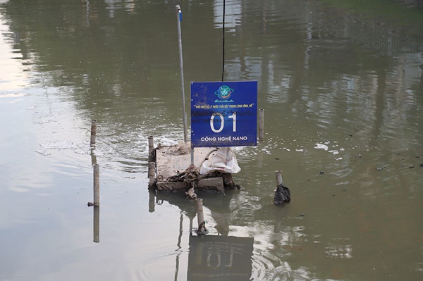 Trực tiếp đứng giữa lòng sông, TS Jun đưa bùn lên mũi ngửi và đánh giá không còn thấy nhiều mùi, một phần là do khả năng xử lý chất thải hữu cơ của máy Bioreactor và một phần là do các tấm vật liệu Nano đã đặt xuống sông trước đó. Sau 3 ngày, lượng khí amoniac (NH3) gây mùi hôi thối đã giảm nhanh chóng