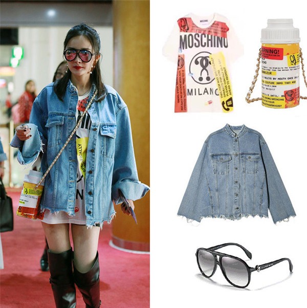 Bộ đồ món nào cũng vô cùng cá tính của Dương Mịch cũng ngốn kha khá tiền của nữ diễn viên. Mẫu áo thun họa tiết sặc sỡ của Moschino giá gần 8 triệu đồng, túi xách hình hộp thuốc cùng hãng gần 21 triệu đồng, kính mắt Alexander McQueen giá 9,7 triệu đồng, áo jeans Stlenanda 12 triệu đồng.