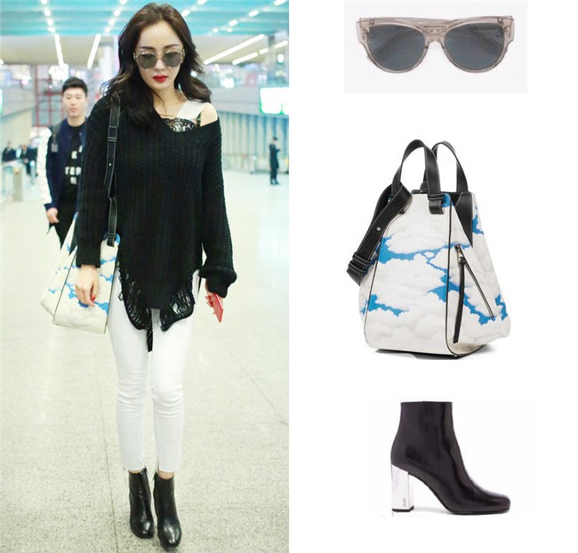 Kính mắt là phụ kiện không thể thiếu khi ra phố của nhiều ngôi sao. Dương Mịch chọn kính Sant Laurenr 11,5 triệu đồng viền hồng trẻ trung để giúp cây đồ đen, trắng thêm nổi bật. Đôi giày cổ cao cũng có giá chẳng hề rẻ, khoảng 27 triệu đồng. Mẫu túi xách hình mây trời hấp dẫn của Loewe cũng khiến cô phải rút ví 79,5 triệu đồng.