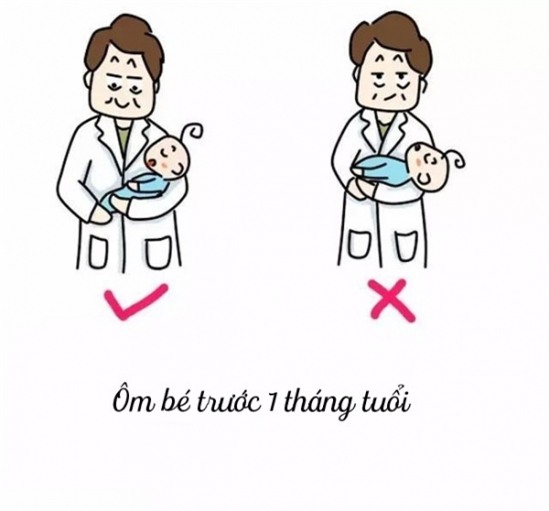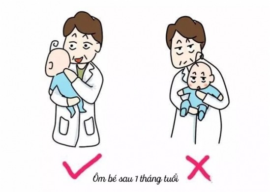 Vì vậy, người ta thường nói, bế trẻ con cũng cần có "kỹ năng".Tốt nhất, nên bế bé nằm hơi chếch người và dùng tay nâng sau gáy của bé trong tháng đầu tiên.
