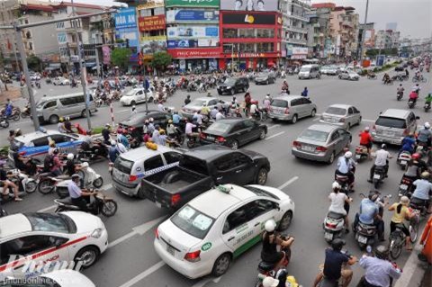 | Khung cảnh lộn xộn khi dừng đèn đỏ tại ngã tư Xã Đàn - Phạm Ngọc Thạch. |