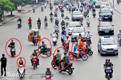 | Một lượng lớn người tham giao thông ở Hà Nội đang coi thường pháp luật và coi thường luôn tính mạng của chính mình khi không đội mũ bảo hiểm. |