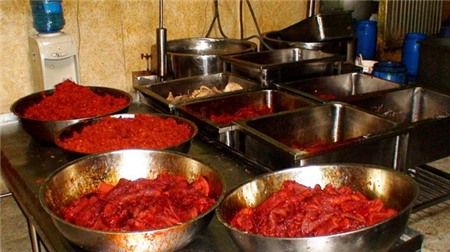 Khi kiểm tra, bên trong kho xưởng sản xuất la liệt những thau nhôm lớn đựng đầy thịt heo. Nhiều thùng hóa chất màu cam, màu đỏ dùng để tẩm ướp thịt heo cũng được phát hiện. Mặc dù nguyên liệu là thịt heo thế nhưng trong kho lại có hàng trăm thùng khô bò thành phẩm đã được đóng gói kĩ lưỡng để chuẩn bị xuất xưởng.