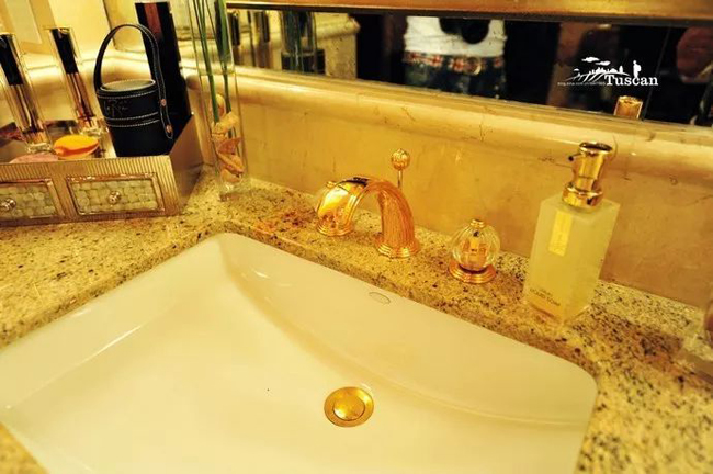 Vòi nước, bình rửa tay, xà phòng, nước rửa tay hay thậm chí là nút chặn bồn rửa tay đều được làm từ vàng.