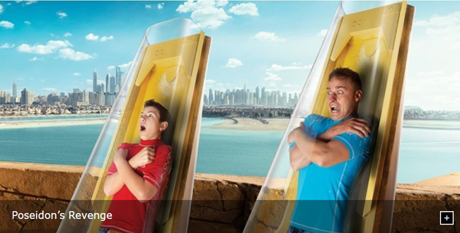 Trò chơi gây đau tim “Sự trả thù của Poseidon”. Người chơi sẽ nằm trong máng nước đóng kín và trượt xuống với vận tốc cực cao.