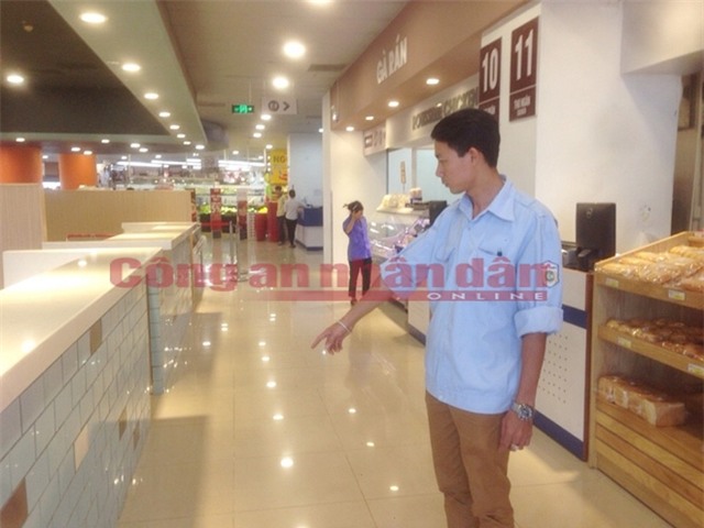 Anh Nguyễn Xuân Hoàn, nhân viên bảo vệ siêu thị Fivimax chỉ nơi đối tượng khống chế cháu Bảo |