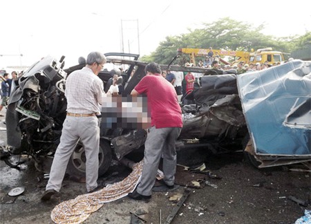 Anh Ngọc chạy ra thì đúng lúc chiếc xe tải lao qua lề trái, tông thẳng vào ôtô 16 chỗ do anh Trần Thanh Sang (37 tuổi) chạy từ TP Cần Thơ lên TP HCM gây thêm một tiếng động vang trời. Cú va chạm làm xe tải lật nhào, văng vào lề gần chốt bảo vệ của anh Ngọc. Đầu xe tải bẹp dúm, mui văng xa và dựng đứng ngay dải băng rôn Hãy lái xe bằng cả trái tim với thông điệp "Hãy nghĩ và giảm tốc độ" treo bên đường.